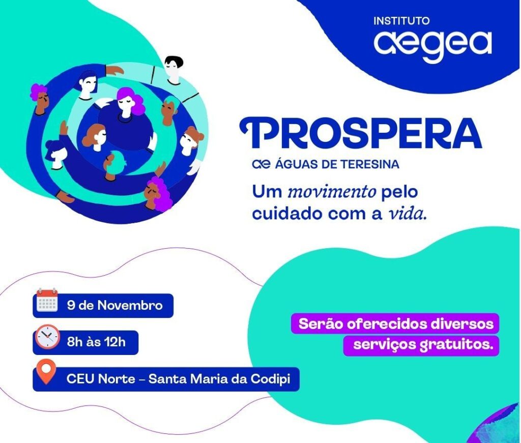 A Águas de Teresina, por meio do Instituto Aegea, realiza no dia 9 de novembro a 1ª edição do “Prospera – Um movimento pelo cuidado com a vida”. Em Teresina, a ação vai acontecer no  Centro Educacional Unificado (CEU Norte) Santa Maria da Codipi , bairro Santa Rosa, a partir das 8h, com serviços gratuitos de saúde, orientações jurídicas, entre outros.