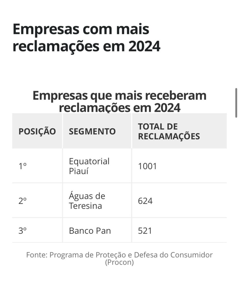 O Programa de Proteção e Defesa do Consumidor (Procon) do Piauí divulgou, nesta terça-feira (18), um levantamento com as empresas e segmentos mais reclamados pelos consumidores em 2024. Segundo os dados, os principais alvos de insatisfação foram instituições bancárias e prestadoras de serviços essenciais, como energia elétrica, abastecimento de água, esgotamento sanitário e telefonia.