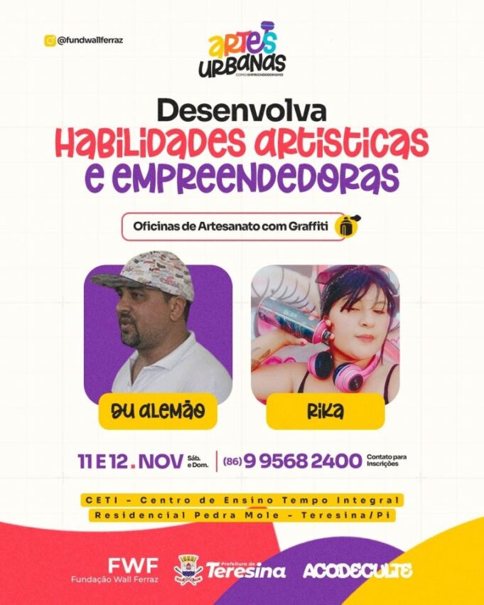 A Prefeitura de Teresina por meio da Fundação Wall Ferraz, em parceria com a ACODECUTE, está com inscrições abertas para o projeto “Artes Urbanas, como Empreendedorismo”, no bairro Pedra Mole, zona Leste de Teresina.