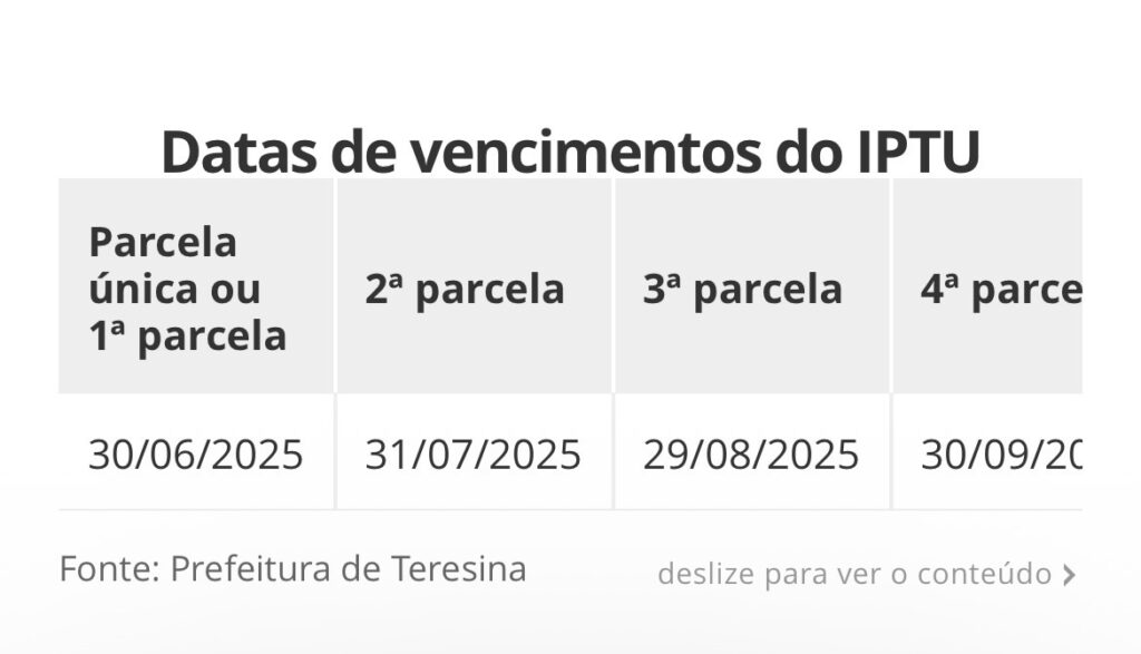 O prazo para o pagamento da segunda parcela do Imposto Predial e Territorial Urbano (IPTU) 2025 em Teresina termina nesta sexta-feira (30). O tributo pôde ser quitado em cota única, com desconto de 7%, ou parcelado em até seis vezes.