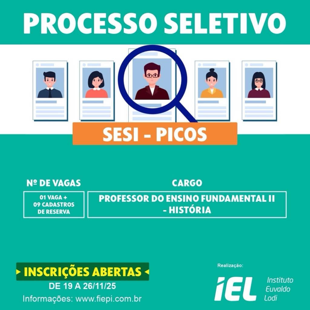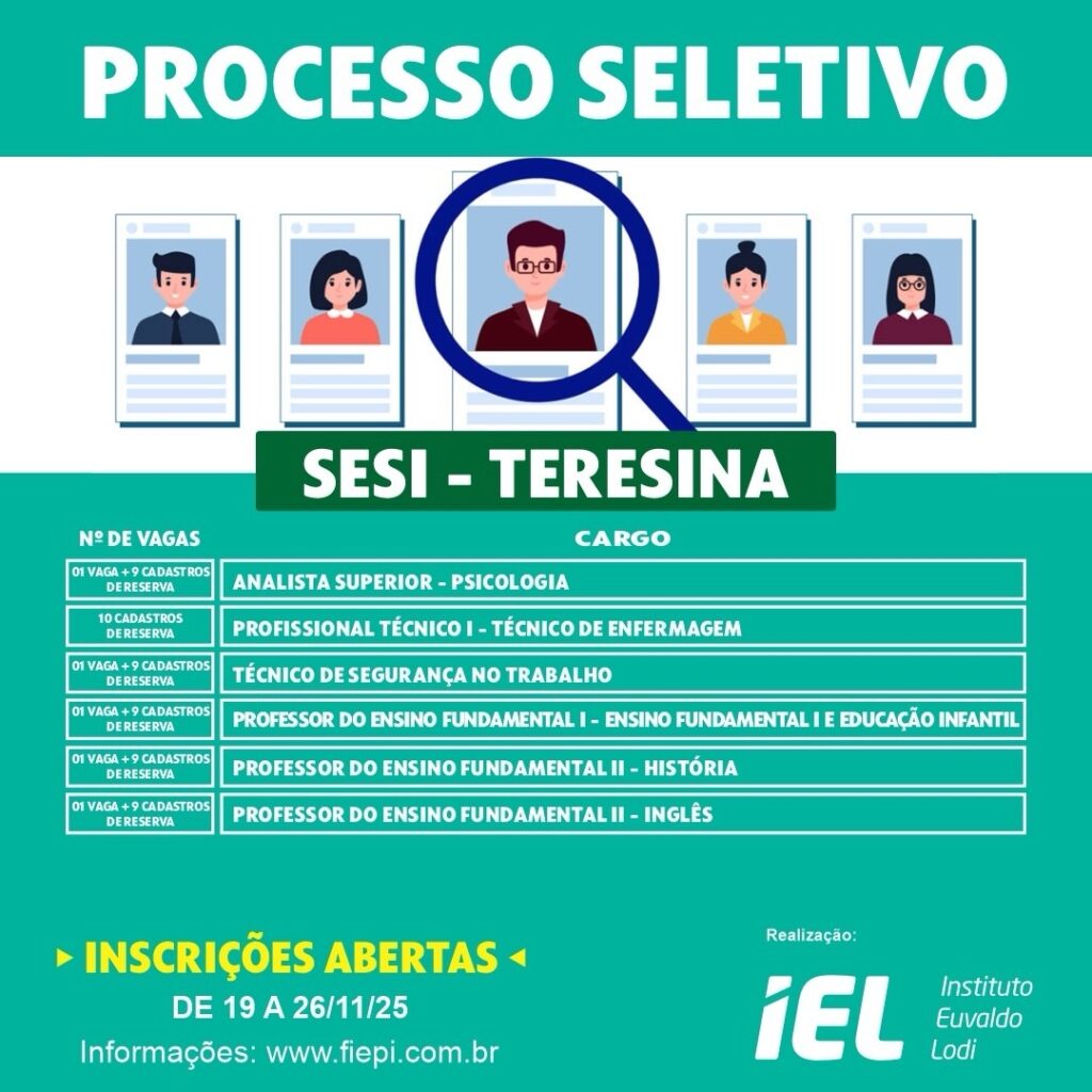 O Serviço Social da Indústria – SESI Piauí por meio do Instituto Euvaldo Lodi está com inscrições abertas para processo seletivo para 07 vagas e 64 cadastros de reserva distribuídas nas cidades de Teresina e Picos. Os cargos são de Analista Superior – Psicologia; Profissional Técnico l – ocupação: Técnico de Enfermagem – Teresina/PI; Técnico de Segurança no Trabalho – ocupação: Técnico de Segurança no Trabalho – Teresina/PI; Professor de Ensino Fundamental l – área: Ensino Fundamental I e Educação Infantil – Teresina/PI; Professor de Ensino Fundamental ll – área: História – Teresina/PI; Professor de Ensino Fundamental ll – área: Inglês – Teresina/PI; Professor de Ensino Fundamental ll – área: História – Picos/PI do quadro de pessoal da entidade, para atuar no município de Teresina e Picos de acordo com as descrições das vagas.